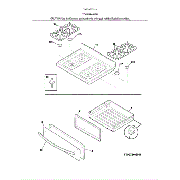 This main top is the upper cooktop panel that covers and protects the range's burners and internal components while providing a stable surface for cookware. It restores the cooktop's appearance and containment of spills. What it does: