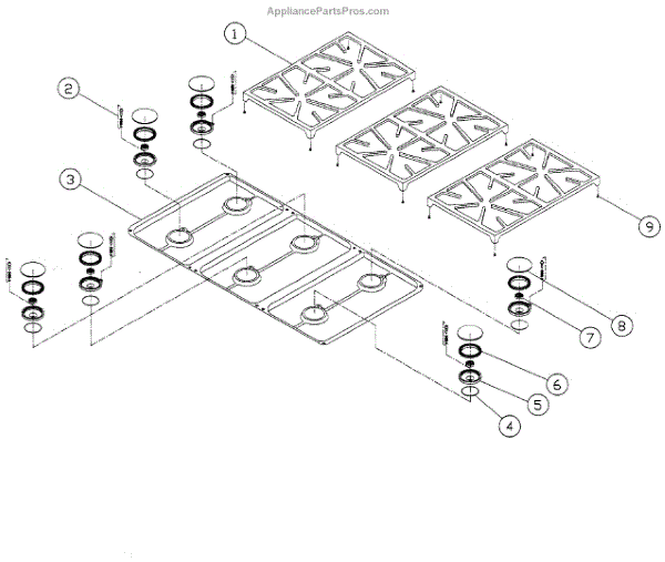 • Remove grates, burner caps, and the burner head to access the O-ring; note the original orientation.