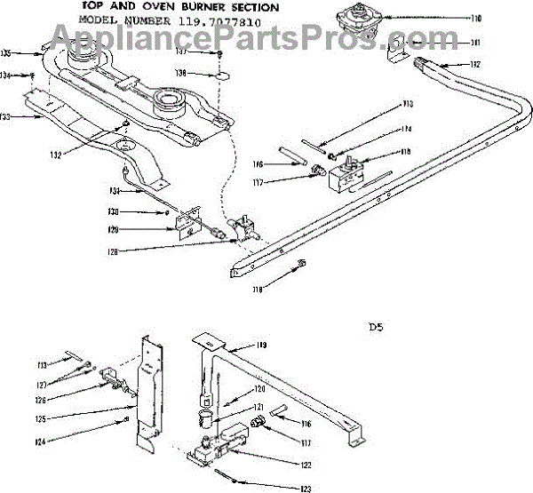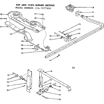Parts for Kenmore 119.7077810 (1197077810, 119 7077810): Top And Oven Burner Section Parts