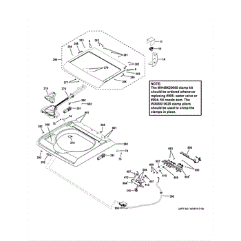This lid lock assembly secures the top-load washer lid and reports lid status to the control. Replacing a worn or failed lock restores safe spin operation and stops cycle interruptions caused by the lid not being detected or locked.