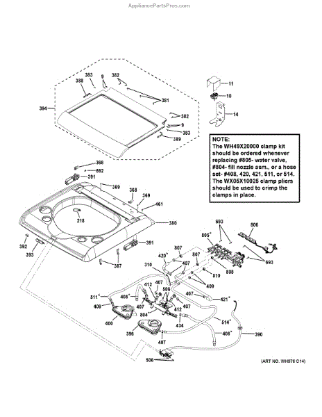 This lid lock assembly secures the top-load washer lid and reports lid status to the control. Replacing a worn or failed lock restores safe spin operation and stops cycle interruptions caused by the lid not being detected or locked.