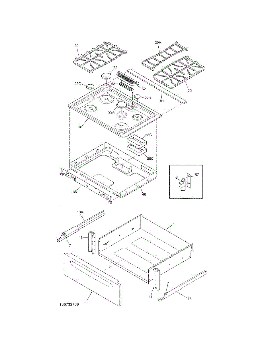 Metal main top assembly for ranges. Replaces cracked, dented, or damaged cooktop surfaces. Structural component that covers the burner area.