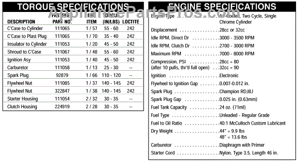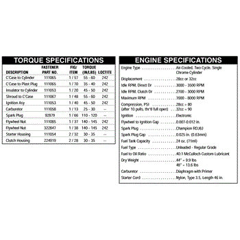 Parts for Mcculloch 41BD310Q077: Torque & Engine Specifications Parts