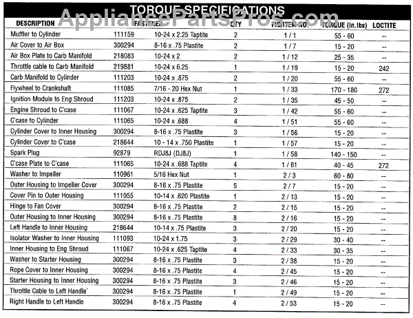 Parts for Mcculloch 41BS321G077: Torque Specifications Parts
