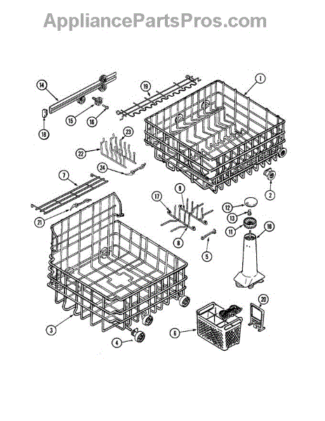 This is an upper dish rack assembly for dishwashers. It is located in the top section of the dishwasher and is meant to ensure dishes stay in place while the dishwasher is running. The dish rack assembly is durable but can experience damage, stains, or other issues. This may make it unsuitable for holding dishes in the appliance. If the part is damaged or malfunctioning, it should be replaced with a new part.This is a simple replacement that takes only a few minutes to complete. First, open up the dishwasher. Remove the bottom rack if desired to create more room to work with the upper dish rack assembly. Take a small flathead screwdriver and use it to release the retaining tabs located on the stop clips. Remove the stop clips and the old dish rack assembly will slide out. Align the new assembly and slide it into place before reassembling other small parts.This upper dish rack assembly is used as an authentic OEM replacement part for dishwashers manufactured by Maytag, Norge, Jenn Air, Admiral, Amana, Crosley, and Magic Chef. The part is sold as an individual component.