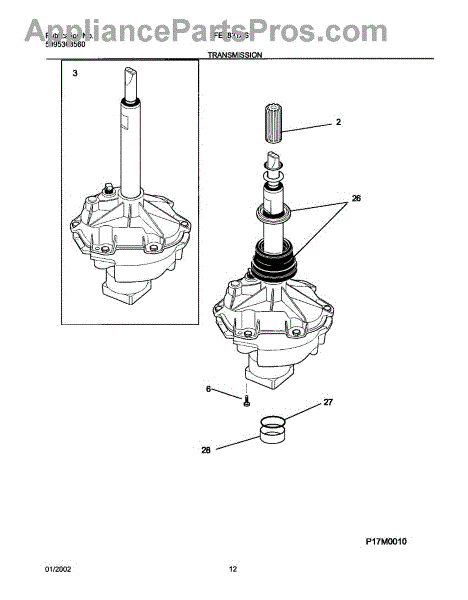 This transmission assembly drives the agitation and spin cycles by transferring motor power to the tub. Replacing a worn transmission helps restore proper wash action and spin performance.