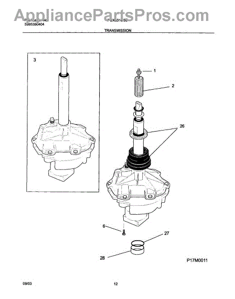 This replacement spacer positions the transmission bearing block to help maintain proper alignment and drivetrain spacing for reliable washer operation. It restores correct fit where worn or damaged spacers cause misalignment. What it does