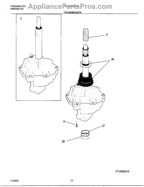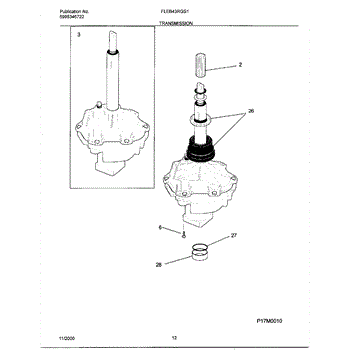 This transmission assembly drives the agitation and spin cycles by transferring motor power to the tub. Replacing a worn transmission helps restore proper wash action and spin performance.