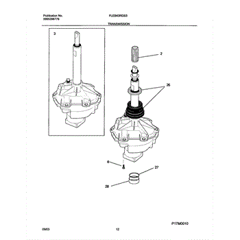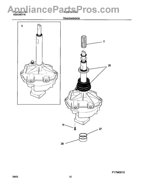 This transmission assembly drives the agitation and spin cycles by transferring motor power to the tub. Replacing a worn transmission helps restore proper wash action and spin performance.