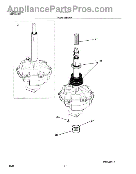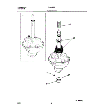 This transmission assembly drives the agitation and spin cycles by transferring motor power to the tub. Replacing a worn transmission helps restore proper wash action and spin performance.