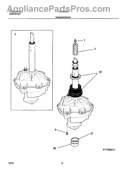 This replacement spacer positions the transmission bearing block to help maintain proper alignment and drivetrain spacing for reliable washer operation. It restores correct fit where worn or damaged spacers cause misalignment. What it does