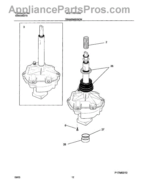 This replacement spacer positions the transmission bearing block to help maintain proper alignment and drivetrain spacing for reliable washer operation. It restores correct fit where worn or damaged spacers cause misalignment. What it does