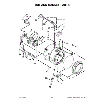 Flexible vent hose mounts on top of the washer tub to release humid air. Replace if cracked, disconnected, or the foam gasket is worn and leaking.