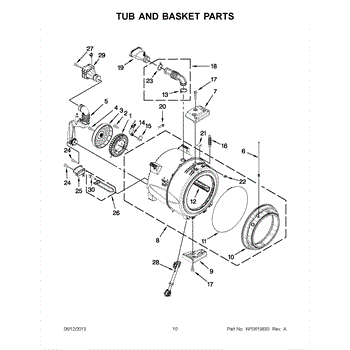 Flexible vent hose mounts on top of the washer tub to release humid air. Replace if cracked, disconnected, or the foam gasket is worn and leaking.