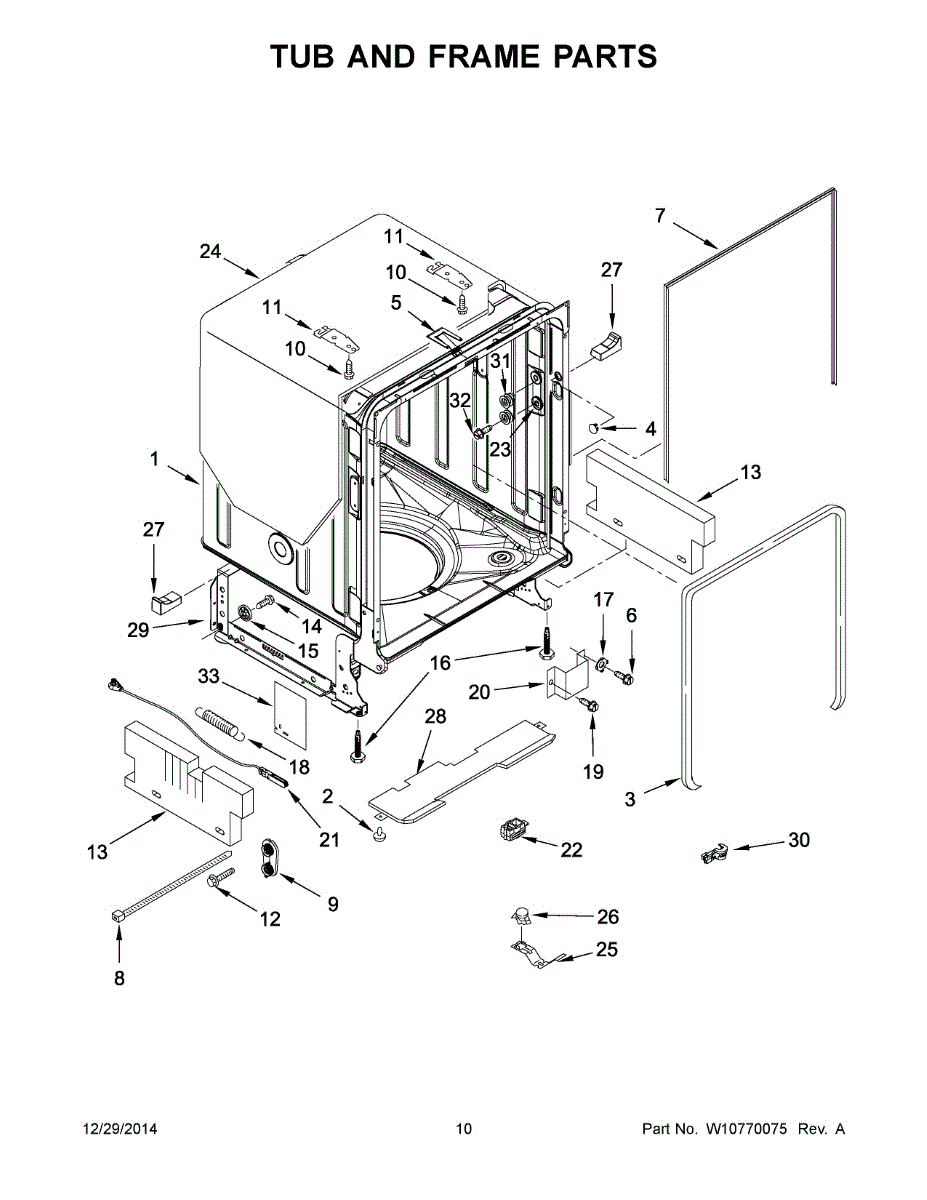 Seals the dishwasher tub to the cabinet opening, reducing noise and preventing gaps. Replace if worn, damaged, or missing for proper fit and sound control.