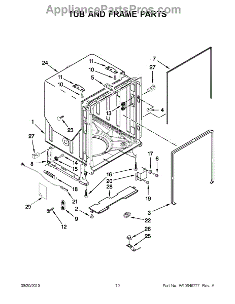 The primary causes of wear or damage to the tub wheel assembly can include regular use, excessive load on the racks, or accidental force applied when loading or unloading dishes. These can lead to broken wheels or dislodged fittings, necessitating replacement to maintain functionality.