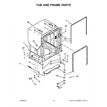 The primary causes of wear or damage to the tub wheel assembly can include regular use, excessive load on the racks, or accidental force applied when loading or unloading dishes. These can lead to broken wheels or dislodged fittings, necessitating replacement to maintain functionality.