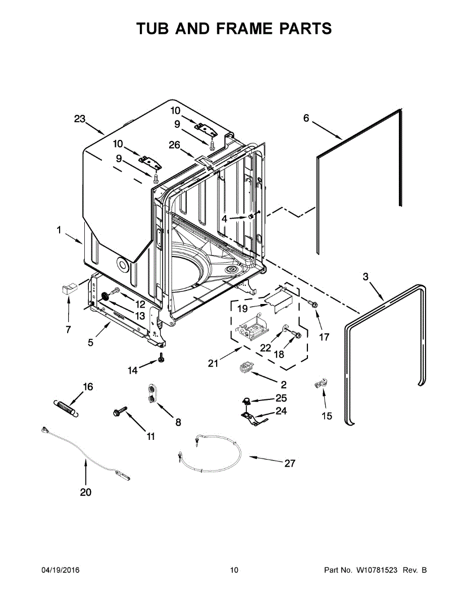 This door latch strike is the catch mounted at the top of the dishwasher tub opening. It provides a secure engagement point for the door latch, helping the door close firmly so cycles can start and run properly. What it does: