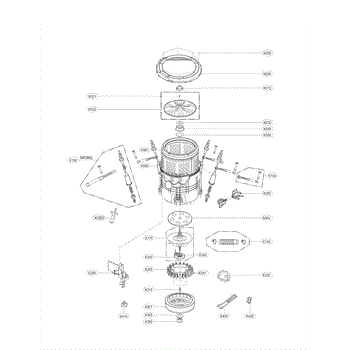 Balancer assembly mounts to the washer basket to counterbalance loads during spin. Replace if cracked, damaged, or causing excessive vibration.