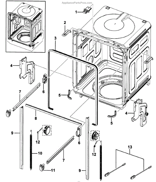 Stopper rail assembly for dishwasher interior. Maintains alignment and stability of internal components. Replace if cracked, broken, or missing.