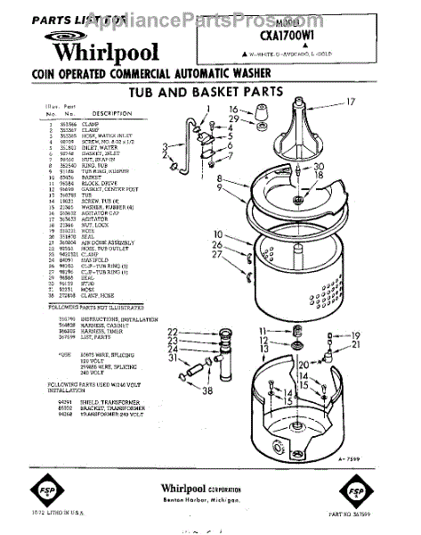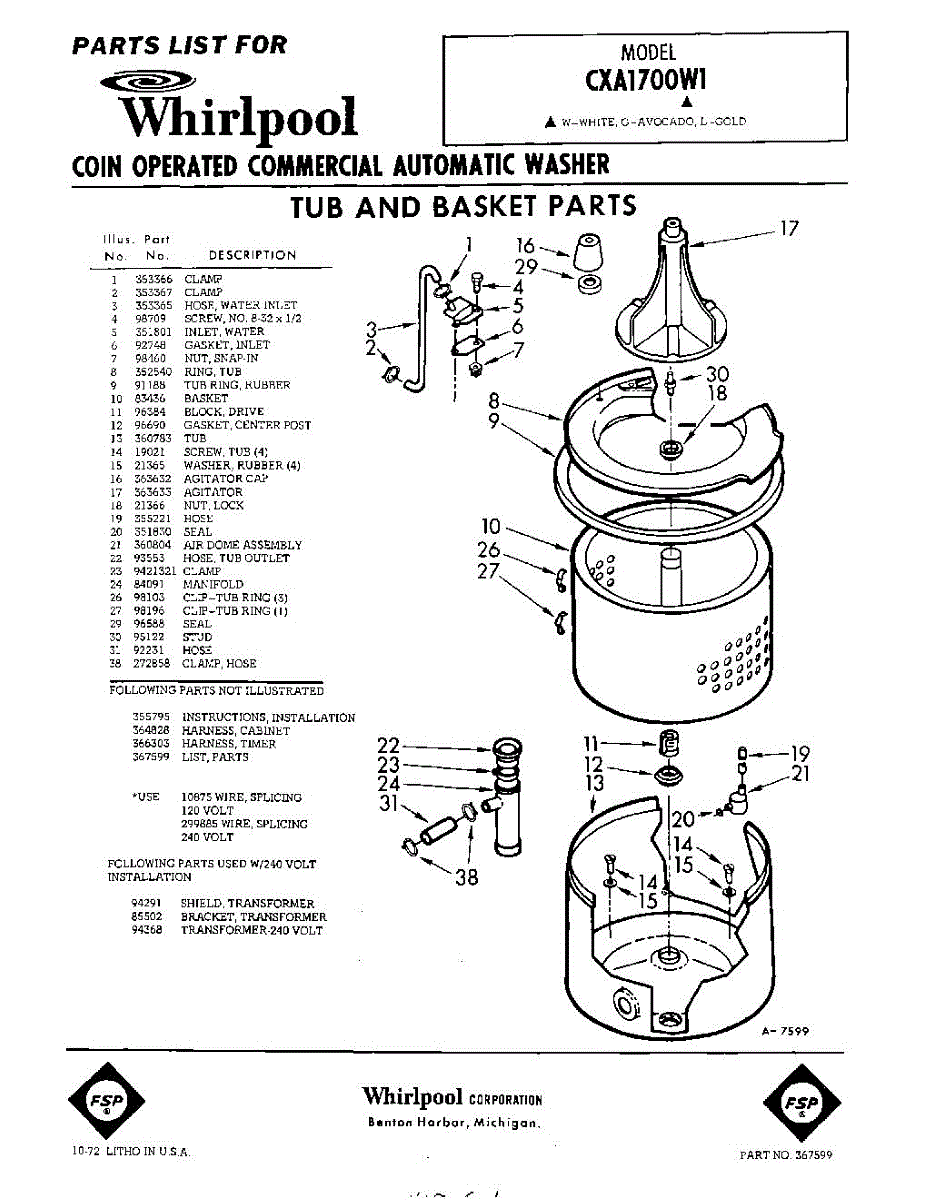 Parts for Whirlpool CXA1700W1: 01 - Tub And Basket , Lit / Optional Parts