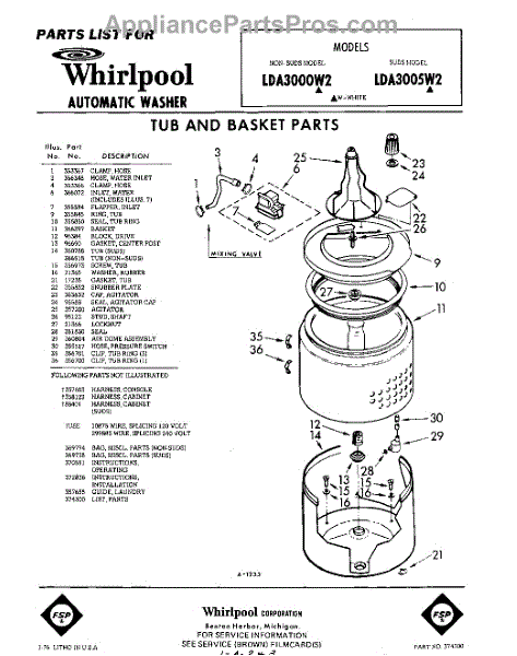 Parts for Whirlpool LDA3005W2: 01 - Tub And Basket , Lit / Optional Parts