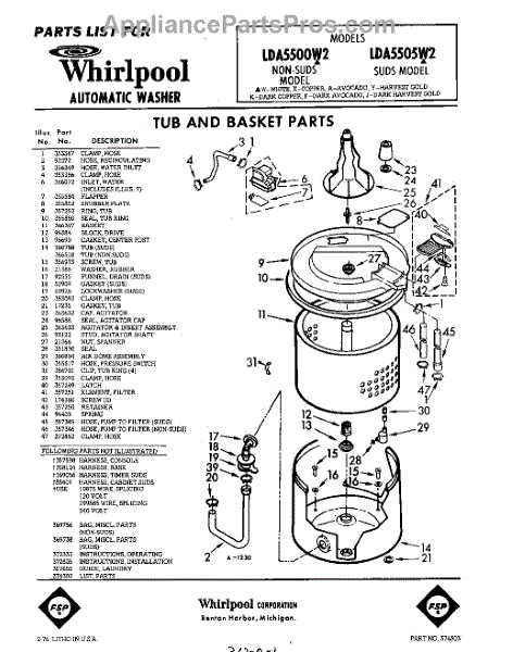 Parts for Whirlpool LDA5505W2: 01 - Tub And Basket , Lit / Optional Parts