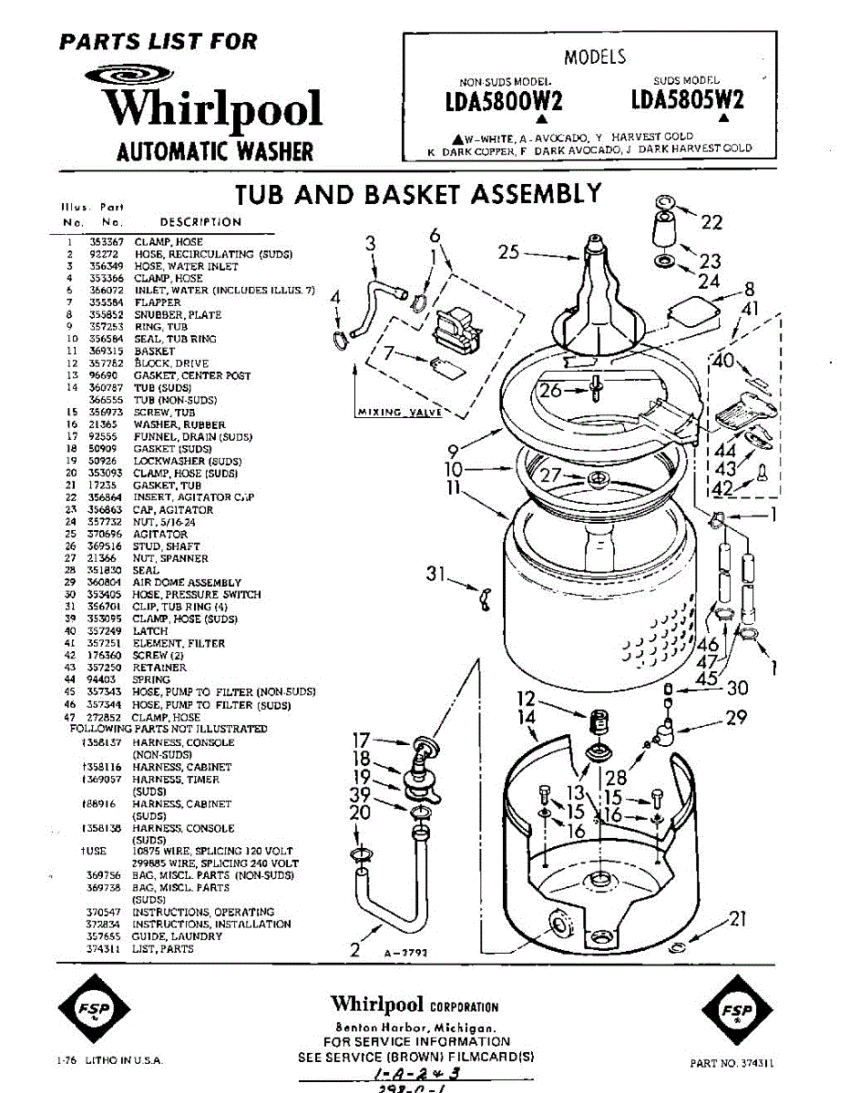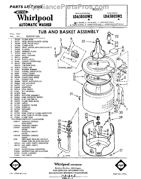 Parts for Whirlpool LDA5800W2: 01 - Tub And Basket , Lit / Optional Parts