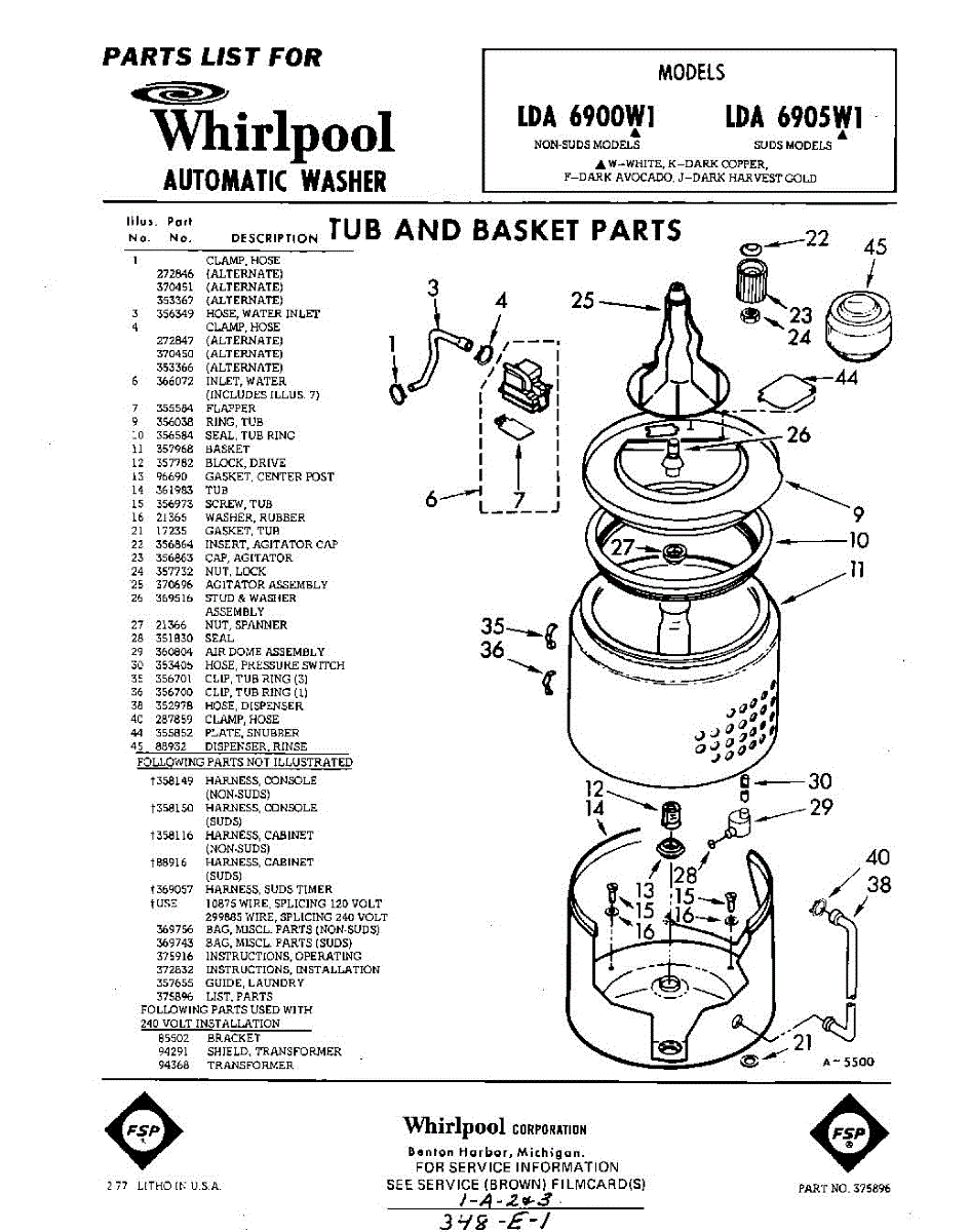Parts for Whirlpool LDA6905W1: 01 - Tub And Basket , Lit / Optional Parts