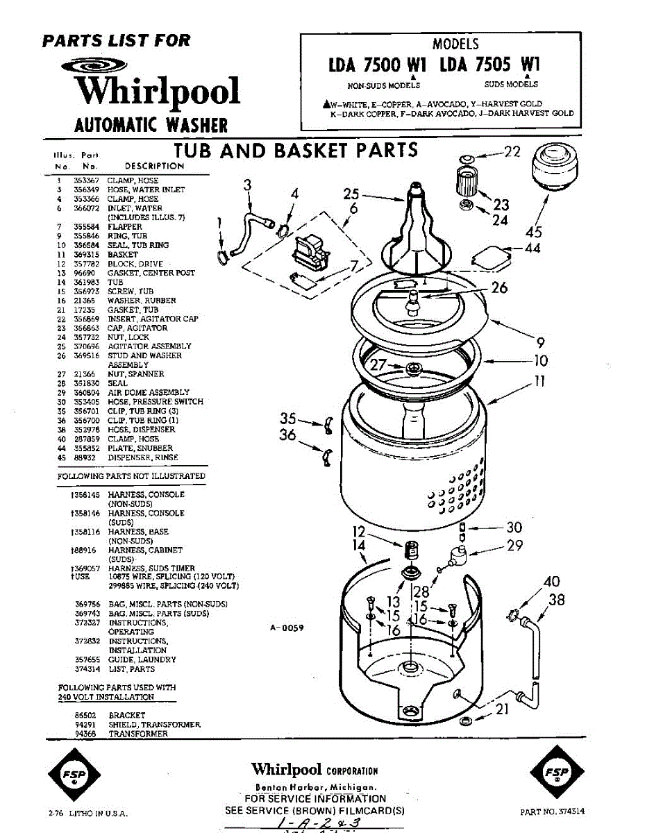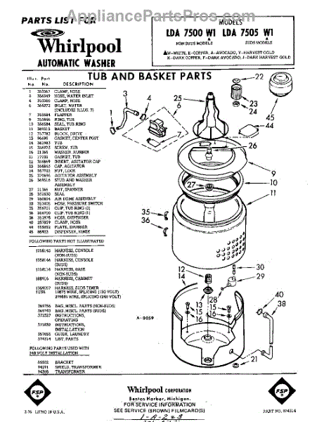 Parts for Whirlpool LDA7505W1: 01 - Tub And Basket , Lit / Optional Parts