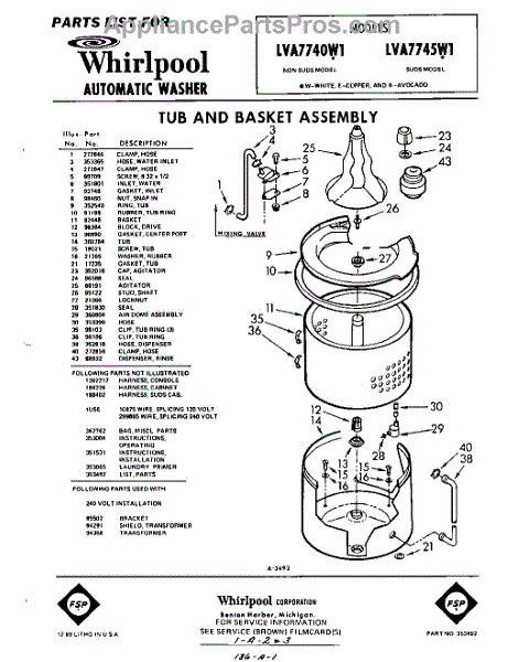 Parts for Whirlpool LVA7740W1: 01 - Tub And Basket , Lit / Optional Parts