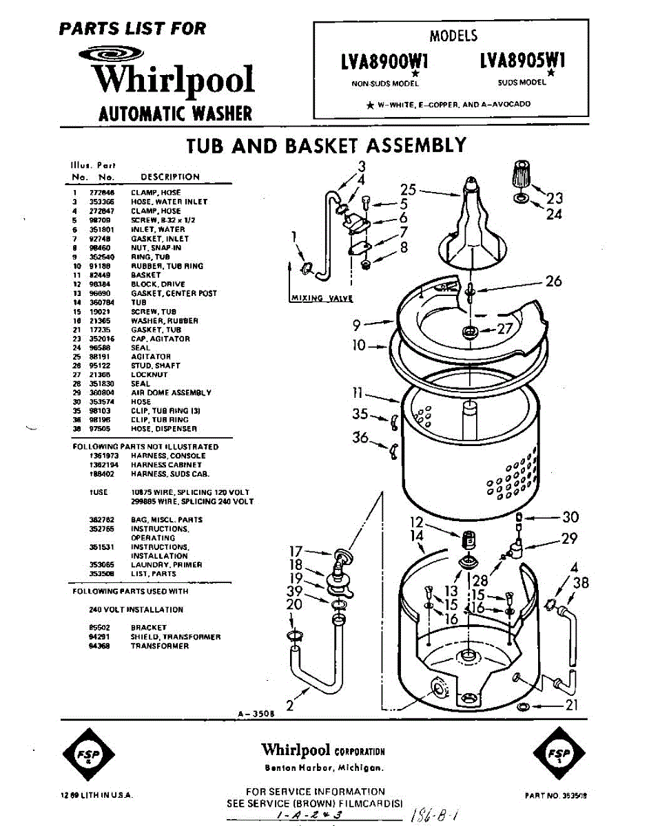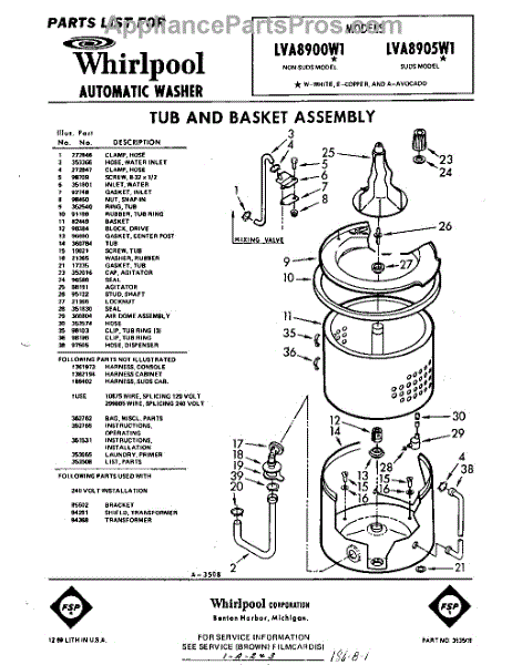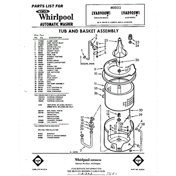 Parts for Whirlpool LVA8905W1: 01 - Tub And Basket , Lit / Optional Parts
