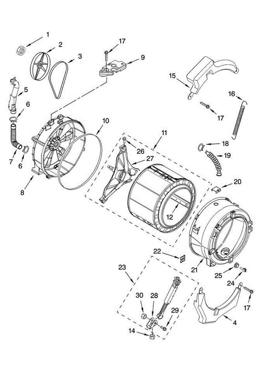 Causes of a bad drum baffle can include breakage or cracking from heavy loads, wear and tear over time, or impact from foreign objects left in pockets.