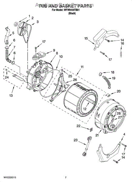 This outer tub is the main water containment housing for a top-load washer. It holds the wash basket and keeps water inside the machine so clothes get cleaned while protecting internal components from leaks and splashes. What it does: