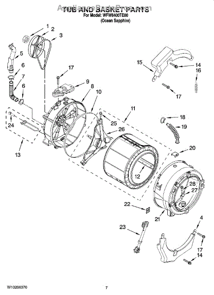 This outer tub is the main water containment housing for a top-load washer. It holds the wash basket and keeps water inside the machine so clothes get cleaned while protecting internal components from leaks and splashes. What it does: