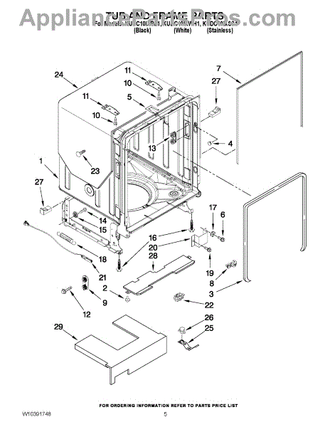 The primary causes of wear or damage to the tub wheel assembly can include regular use, excessive load on the racks, or accidental force applied when loading or unloading dishes. These can lead to broken wheels or dislodged fittings, necessitating replacement to maintain functionality.