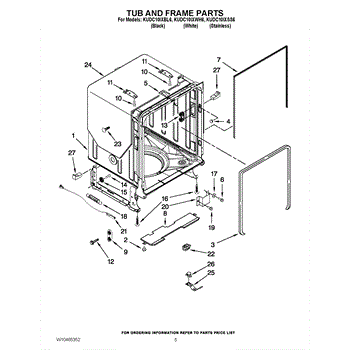 The primary causes of wear or damage to the tub wheel assembly can include regular use, excessive load on the racks, or accidental force applied when loading or unloading dishes. These can lead to broken wheels or dislodged fittings, necessitating replacement to maintain functionality.