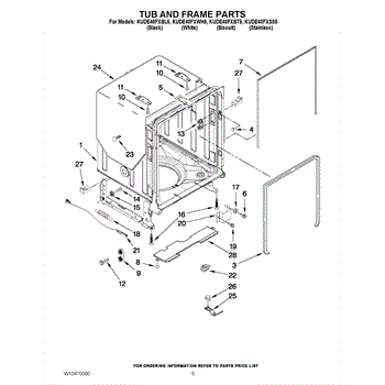 The primary causes of wear or damage to the tub wheel assembly can include regular use, excessive load on the racks, or accidental force applied when loading or unloading dishes. These can lead to broken wheels or dislodged fittings, necessitating replacement to maintain functionality.