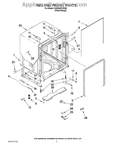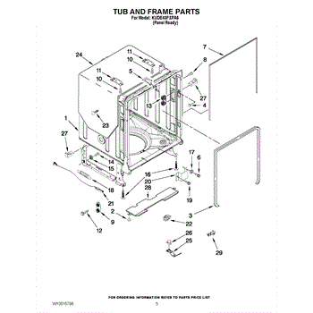 The primary causes of wear or damage to the tub wheel assembly can include regular use, excessive load on the racks, or accidental force applied when loading or unloading dishes. These can lead to broken wheels or dislodged fittings, necessitating replacement to maintain functionality.