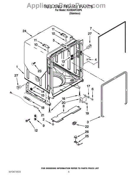 The primary causes of wear or damage to the tub wheel assembly can include regular use, excessive load on the racks, or accidental force applied when loading or unloading dishes. These can lead to broken wheels or dislodged fittings, necessitating replacement to maintain functionality.