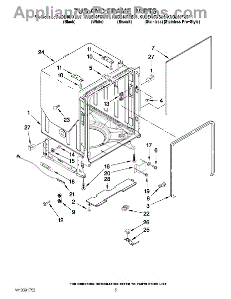 The primary causes of wear or damage to the tub wheel assembly can include regular use, excessive load on the racks, or accidental force applied when loading or unloading dishes. These can lead to broken wheels or dislodged fittings, necessitating replacement to maintain functionality.