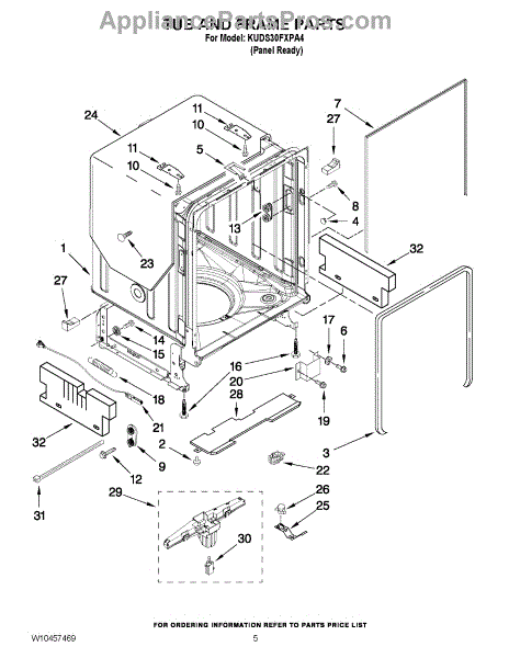 The primary causes of wear or damage to the tub wheel assembly can include regular use, excessive load on the racks, or accidental force applied when loading or unloading dishes. These can lead to broken wheels or dislodged fittings, necessitating replacement to maintain functionality.