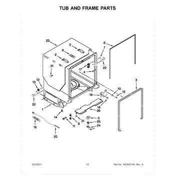 The primary causes of wear or damage to the tub wheel assembly can include regular use, excessive load on the racks, or accidental force applied when loading or unloading dishes. These can lead to broken wheels or dislodged fittings, necessitating replacement to maintain functionality.
