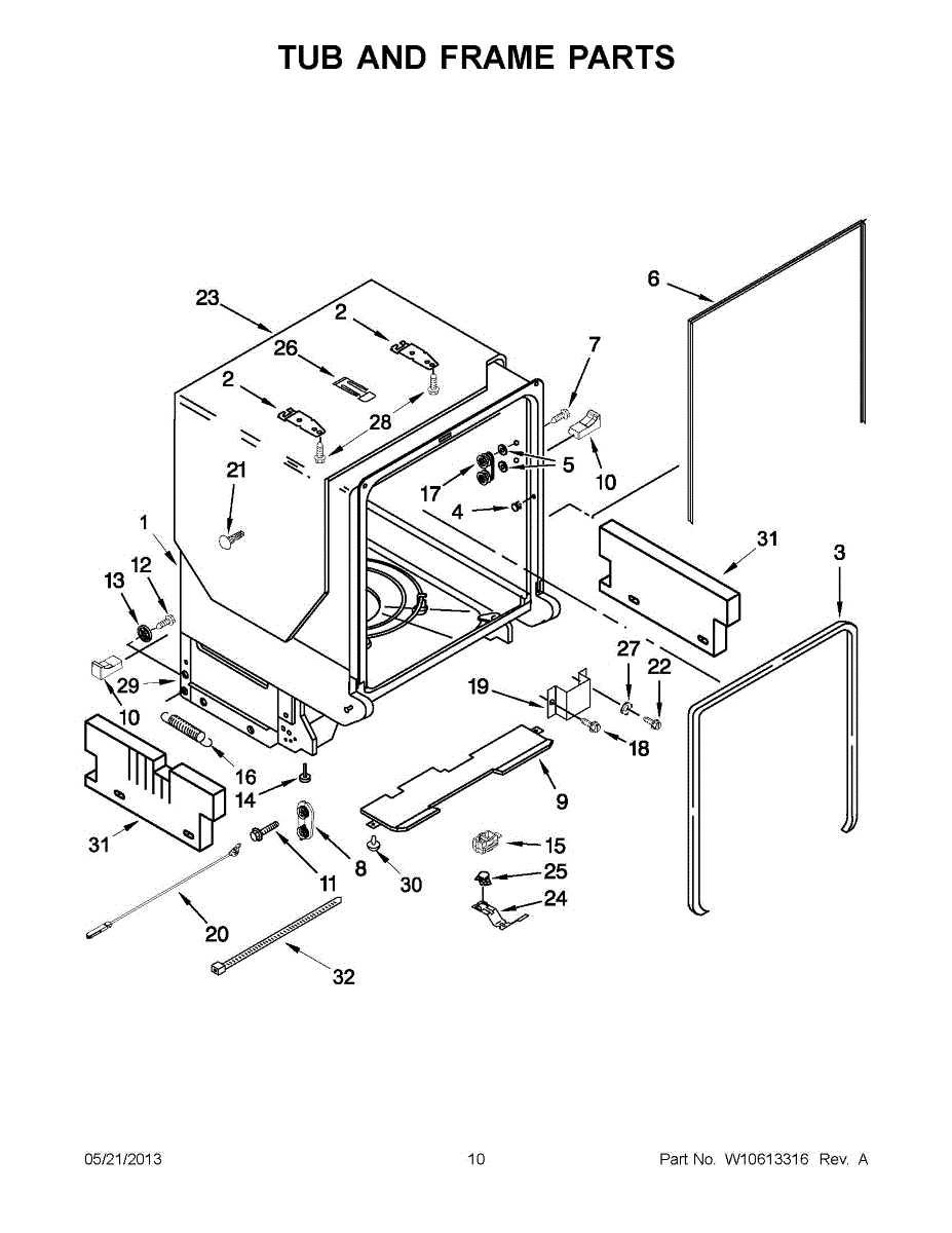 Seals the dishwasher tub to the cabinet opening, reducing noise and preventing gaps. Replace if worn, damaged, or missing for proper fit and sound control.