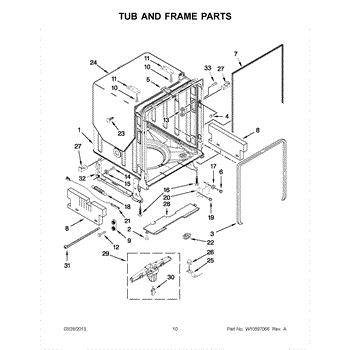 The primary causes of wear or damage to the tub wheel assembly can include regular use, excessive load on the racks, or accidental force applied when loading or unloading dishes. These can lead to broken wheels or dislodged fittings, necessitating replacement to maintain functionality.