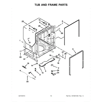 The primary causes of wear or damage to the tub wheel assembly can include regular use, excessive load on the racks, or accidental force applied when loading or unloading dishes. These can lead to broken wheels or dislodged fittings, necessitating replacement to maintain functionality.