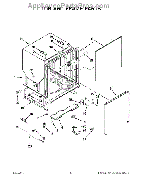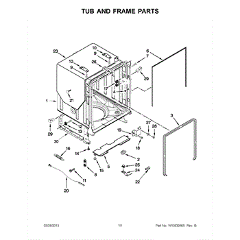 The primary causes of wear or damage to the tub wheel assembly can include regular use, excessive load on the racks, or accidental force applied when loading or unloading dishes. These can lead to broken wheels or dislodged fittings, necessitating replacement to maintain functionality.