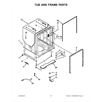 The primary causes of wear or damage to the tub wheel assembly can include regular use, excessive load on the racks, or accidental force applied when loading or unloading dishes. These can lead to broken wheels or dislodged fittings, necessitating replacement to maintain functionality.