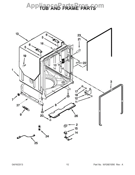 The primary causes of wear or damage to the tub wheel assembly can include regular use, excessive load on the racks, or accidental force applied when loading or unloading dishes. These can lead to broken wheels or dislodged fittings, necessitating replacement to maintain functionality.