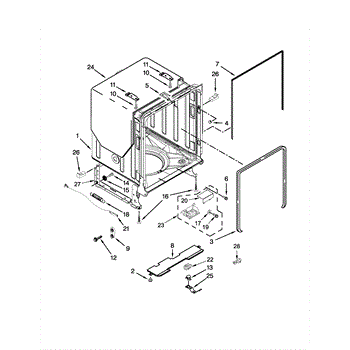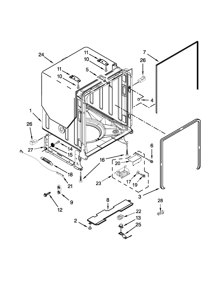 This door latch strike is the catch mounted at the top of the dishwasher tub opening. It provides a secure engagement point for the door latch, helping the door close firmly so cycles can start and run properly. What it does: